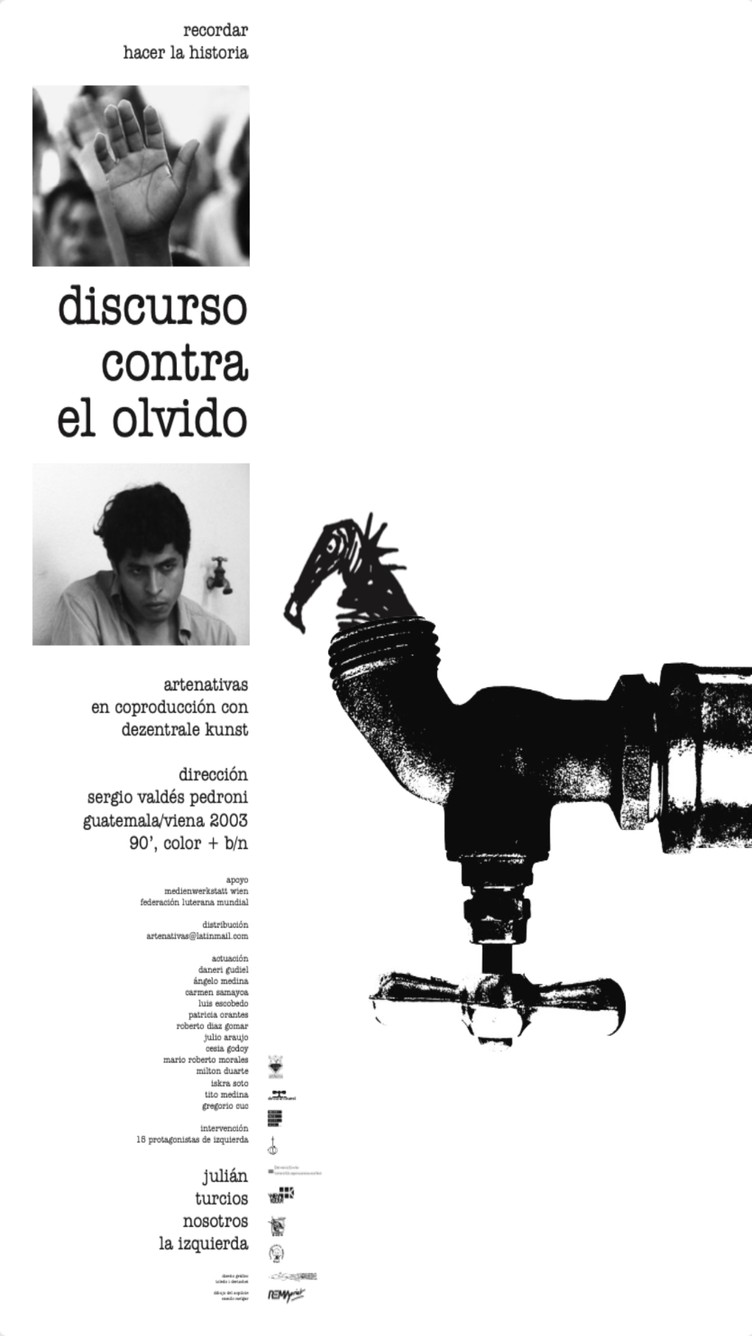 DISCURSO CONTRA EL OLVIDO Back INFORMACIÓN Thumbnail TÍTULODISCURSO CONTRA EL OLVIDODESCRIPCIÓNA la escucha de la voz cansada de los sobrevivientes de antiguos combates, Sergio Valdés Pedroni sale en busca de las voces germinales y convergentes de la renovación de la izquierda política en el país.REG.AG-088FECHA2003GÉNERODocumentalPAÍS DE PRODUCCIÓNGuatemalaDURACIÓN90REALIZACIÓNSergio Valdés PedroniPRODUCTORAarteNativas Portada e Imagen Still AG-088 Discurso contra el olvido stills copia AG-088-Discurso-contra-el-olvido-afiche Continuar navegando NAVIDAD GUATEMALTECA THE COST OF COTTON (EL COSTO DEL ALGODÓN) Back to items list